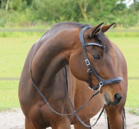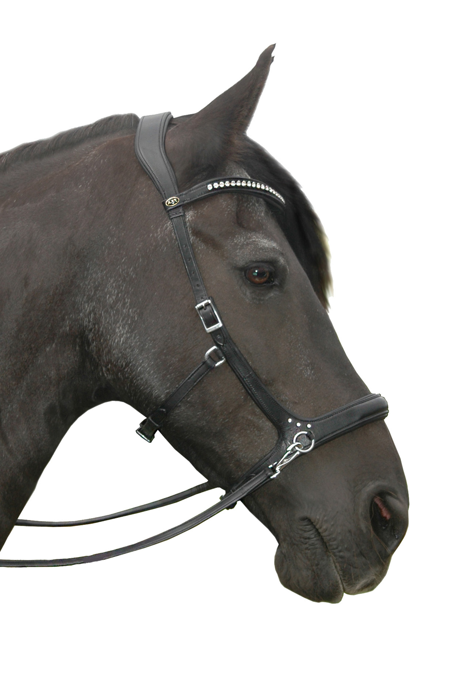 Muserolle et têtière de forme anatomique avec rembourrage, sangle de mâchoire réglable, fournie avec de luxueuses rênes en cuir souple et antidérapantes avec clips en laiton, cette bride est un type 3 de la marque F.R.A. système sans mors